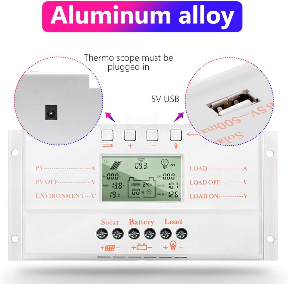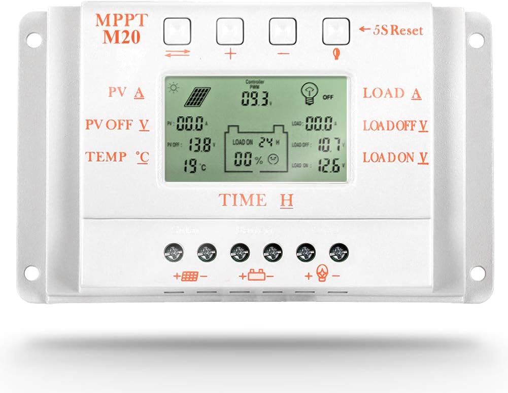 NOTE1: not true MPPT ,there is no large transformer coil insideNOTE2:Optional USB 5V charging (500mA£¬Not suitable Apple iphone 5 5G)M10A/M20A/M30A solar controller Compared with common solar controllers, it is equipped with temperature compensation function, can make the work efficiency increased by 30%, and can observably prolong the life of the storage battery.it is add the comprehensive protection function makes the whole solar system operate efficiently and safely.30A:.30A Solar Panel Charge Controller Regulator Solar panel 380W/12V 760W/24VCompatible with 760W(24v) solar panel with dark activated function, Max current is 30A TimerIntigrated (Lighting function)Specifics1. Battery (under voltage) recovery voltage:12.6V(12V )2. Charge mode:PWM MODE3. Operating Temperature:-10°C~60°C4. Storage Temperature:-30°C~70°C5. Voltage:12V/24V6. Maximum open circuit voltage of the sola:18V-24V(12V system)36V-48V(24V system)7. Battery float voltage:13.8V(12V system)/27.6V(24V system)8. Solar panels maximum open circuit voltag:≤48V9. Battery (under voltage) protection:10.6V(12V system)/21.2V(24V system) Package contents:1x Solar Controller1x English User Manual1x Temp. Sensor