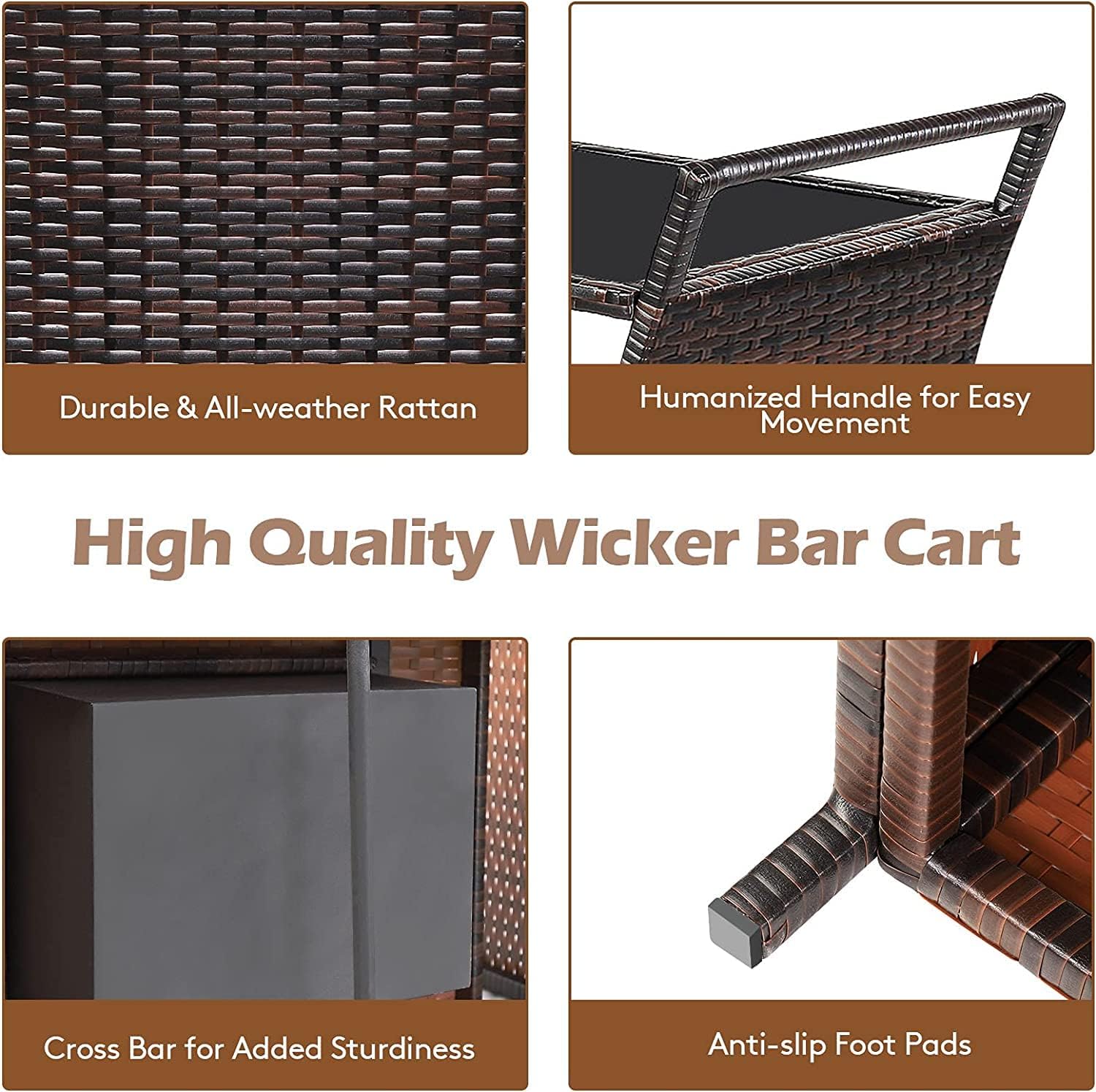 Description: Happygrill rattan bar cart with ice bucket is a perfect choice for you to entertain guests or have a meal with your family members outdoors. Made from solid powder coated steel frame and all-weather rattan, this wine serving cart ensures great stability and durability for long-lasting outdoor or indoor use. Besides, the high quality tempered glass tabletop provides ample space for drinks, snacks and food. Thanks to the flexible wheels and humanized handles, you can easily move the bar cart to any place. Moreover, the modern yet simple design made the cart look great in any setting, which is suitable for garden, patio, balcony, yard, poolside and more. Features: All-weather and wear-resistant rattan ensures long lasting use Tempered glass tabletop offers a spacious and elegant dining space 2.5 gallon large capacity ice bucket to store ice, drinks, wine, etc Humanized handles for hanging towels and easy pull-and-push Anti-slip foot pads increase stability and protect floor from scratching Easy to move around with 2 lockable rolling wheels Smooth glass top is easy to clean with damp cloth Easy to assemble with detailed instruction Specifications: Material: Steel, Iron, Rattan, Glass Product Dimensions: 43" x 18" x 36" (L x W x H) Dimensions of Tabletop: 40.5" x 16" (L x W) Dimensions of Ice Bucket: 13" x 10" x 6" (L x W x H) Ice Bucket Capacity: 2.5 Gallon Net Weight: 26.5 lbs Weight Capacity of Tabletop: 165 lbs Weight Capacity of Ice Bucket: 80 lbs Package includes: 1 x Wicker Bar Cart 1 x Ice Bucket 1 x Instruction