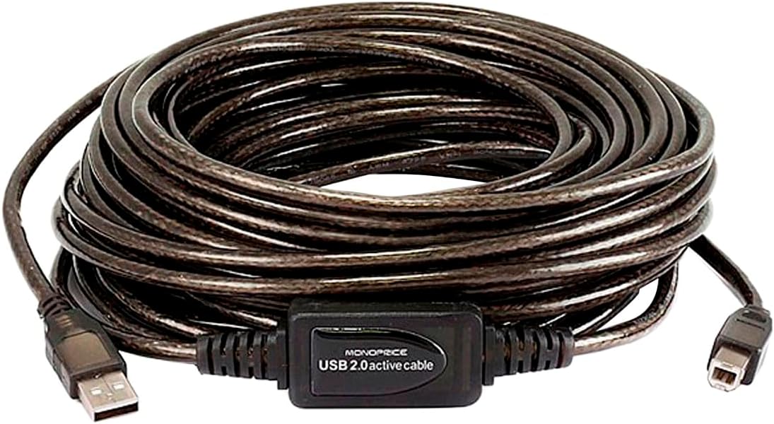 USB 2.0 Active A Male to B male Cable is a bus-powered cable that can be used to increase the length of a device cable without the worry of signal loss and potential performance problems. It contains active electronics which boost the USB signal for maximum reliability and performance over extended distances. It make your PC to connects any USB device with type B female port up to 15m(49ft) such as scanners printers digital camera and other USB peripherals.